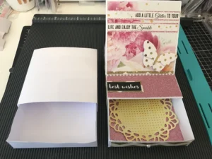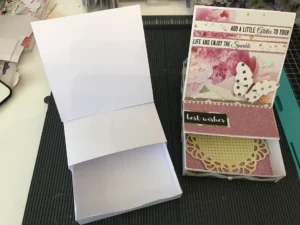 Well done! Now decorate your card/ drawer as you like – I suggest putting something raised such as stick on jewels or pearls about half to two-thirds of the way down the length of the top of your drawer to help the easel card stay in place when displayed.