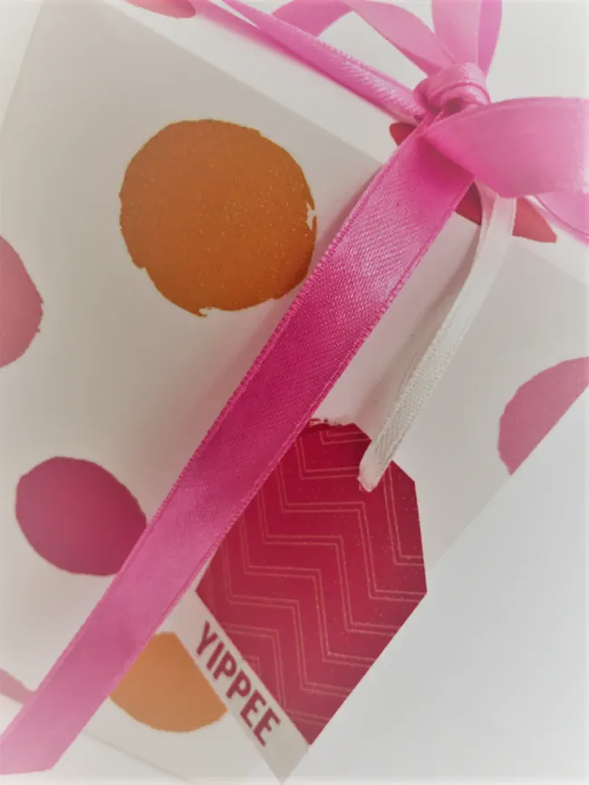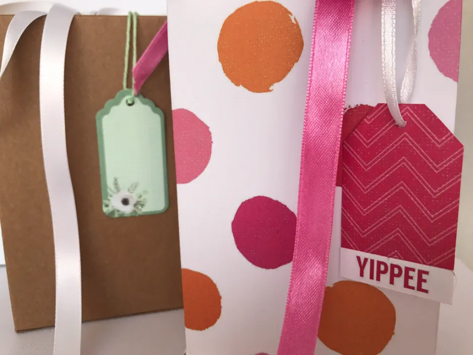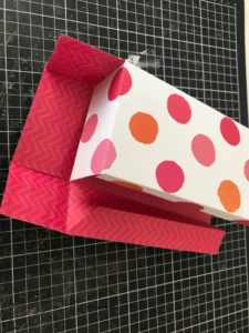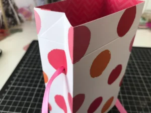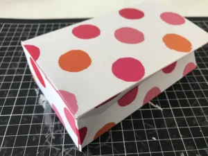 (My bag boxes pictured have are made from Kaisercraft kraft cardstock and Kaisercraft ‘Pop’ collection ‘Polka’ paper)