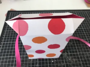 - Take the ends of your ribbon and run the ribbon over the edge folds and tie in a bow in the centre at the top of the box